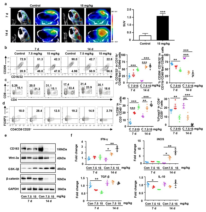图5.Wnt/β-catenin通路抑制剂重新激活胶质瘤模型的免疫应答。(a)左侧是代表性的[18F]DPA714在IDH1WT GL261小鼠模型脑部的PET/CT图像。右侧是IDH1WT GL261小鼠经静脉注射[18F]DPA714示踪剂0.5 h后,小鼠胶质瘤内SUV值的统计图。(b-d)种植IDH1WT GL261细胞的小鼠动物模型经PBS及高低剂量Wnt/β-catenin通路抑制剂(Wnt-C59)分别处理7 d、14 d后肿瘤内促炎型小胶质细胞(CD16/32+)、抑炎型小胶质细胞(CD16/32+ CD206+)、CD8+ T淋巴细胞(CD3+CD8+)以及Treg细胞(CD4+ Foxp3+ CD8- CD25+)含量的流式分析结果图。(e,f)种植IDH1WT GL261细胞的小鼠动物模型经PBS及高低剂量Wnt/β-catenin通路抑制剂(Wnt-C59)分别处理7 d、14 d后肿瘤内CD163,Wnt3a,GSK-3β和β-catenin蛋白的表达以及IFN-γ mRNA,iNOS mRNA,TGF-β mRNA和IL-10 mRNA的表达。