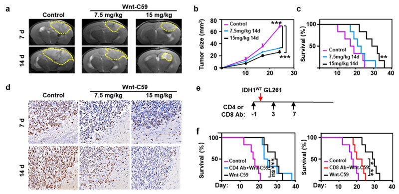 图6. Wnt抑制剂抑制IDH1WT GL261胶质瘤模型生长并提高预后。(a-d)种植IDH1WT GL261细胞的小鼠动物模型经PBS及高低剂量Wnt/β-catenin通路抑制剂(Wnt-C59)分别处理7 d、14 d后脑部的肿瘤大小变化及其胶质瘤中Ki67蛋白的表达情况。(e)上述小鼠模型经CD4 Ab或CD8 Ab处理的时间示意图。(f)经CD4 Ab+15 mg/kg Wnt-C59(蓝色线)、CD8 Ab+15 mg/kg Wnt-C59(红色线)、15 mg/kg Wnt-C59(黑色线)及PBS(紫色线)处理的IDH1WT小鼠胶质瘤模型的Kaplan-Meier生存曲线。