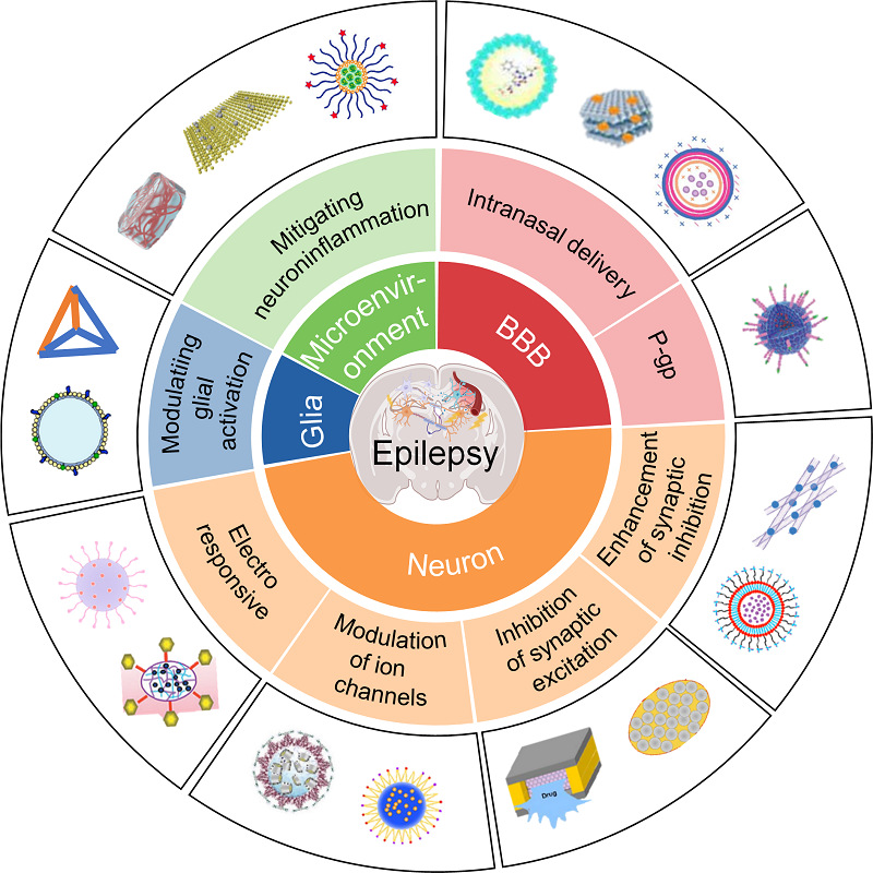 由神经元、星形胶质细胞、小胶质细胞和血管内皮细胞等构成的神经血管复合体(NVC)是脑功能运行的单元基础。NVC中不同细胞间通过物理接触、分子交互和功能协同等方式实现兴奋信号传递、免疫炎性响应、血流能量调节等功能。临床及临床前研究均表明,NVC中任何一个单元结构或功能异常,均会导致神经元的异常放电,与癫痫的演进密切相关,如血脑屏障的破坏、胶质细胞的激活以及微环境稳态失衡等。高效脑部递送与精准药物释放是提升抗癫痫药物疗效并降低毒副作用的关键。近年来,生物纳米技术的快速发展为癫痫等脑部疾病治疗提供了突破性解决方案。
