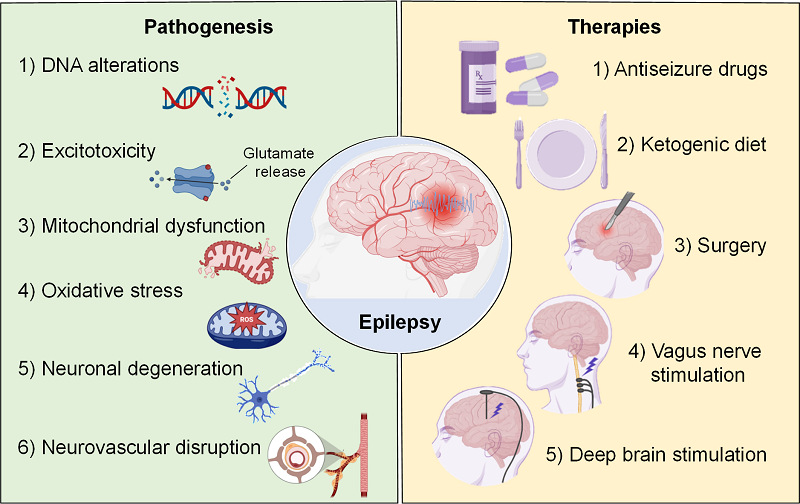 癫痫是一种由中枢神经系统兴奋-抑制平衡失调引发的慢性神经系统疾病,临床表现为反复性、不可预测的异常放电发作。癫痫影响着全球约 7000万人的生活,占疾病总负担的0.75%。反复的癫痫发作不仅加重大脑损伤,还导致神经异常和精神疾病,患者常面临神经生物学改变、认知心理障碍及过早死亡等挑战。癫痫的发病机制涉及遗传易感性增加、神经发育异常、脑血管病变等多种因素的复杂交互(图1)。抗癫痫药物是目前临床主要治疗手段,这类药物均通过调节神经元离子通道或神经递质平衡来控制癫痫发作。尽管临床治疗常用的抗癫痫药物有20余种,但是存在治标不治本,仅可控制癫痫发作状态,无法起到疾病修饰作用或从根本上抑制癫痫的发生发展;且临床约三分之一的患者会出现耐药,约一半左右的患者会遭遇不良的药物反应(图2)。耐药性癫痫患者预后显著恶化:死亡率增加8倍,猝死风险升高3倍,且更易伴发认知损害和精神共病。尽管生酮饮食、手术切除、神经电刺激等技术被用于难治型癫痫治疗,然而它们存在耐受性差、价格昂贵、风险高、侵入性强等不足。因此,开发新颖的癫痫治疗策略对于克服耐药、降低毒副反应、提高癫痫患者预后甚至扭转癫痫疾病进程至关重要。