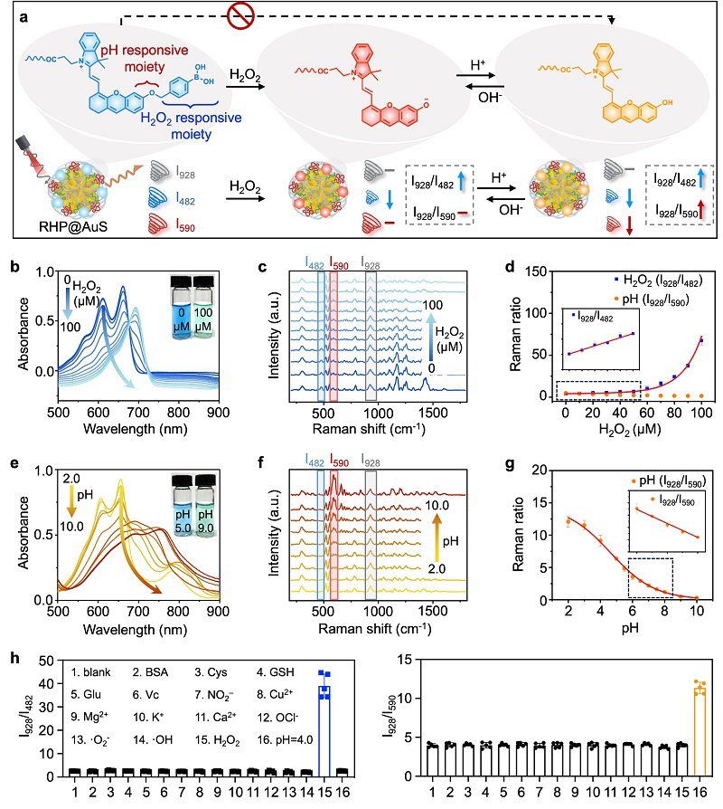 图3. RHP@AuS的H2O2和pH体外响应性验证。(a)RHP@AuS对H2O2和pH的串联双比率响应机制示意图。(b)RHP在不同浓度H2O2中的吸收光谱。(c)RHP@AuS在不同浓度H2O2中的SERS光谱。(d)拉曼峰比I928/I590和I928/I482与H2O2浓度的拟合曲线。(e)H2O2响应后RHP在不同pH缓冲液中的吸收光谱。(f)H2O2响应后RHP@AuS在不同pH值缓冲液中的SERS光谱。(g)拉曼峰比I928/I590随pH值变化的曲线图。(h)RHP@AuS的选择性。