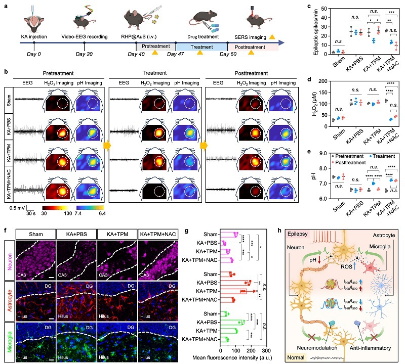 在利用RHP@AuS可视化癫痫期间的pH波动的基础上,我们进一步探索了其评估治疗效果的潜力。传统抗癫痫药物主要通过调控神经元离子通道或神经递质受体来控制症状,但无法阻止癫痫进展,并伴随显著的毒副作用。癫痫发作期间,异常放电和兴奋性毒性引发神经元损伤和炎性因子的释放,导致胶质细胞激活及慢性炎症。基于神经炎症与癫痫发生的密切关系,我们提出了一种“酸碱平衡-炎症调节”的联合疗法(TPM/NAC)。EEG显示,KA诱导的癫痫模型小鼠脑活动显著增强,SERS成像表明癫痫病灶处炎症增加且pH降低。尽管TPM单药治疗暂时控制了癫痫,但停药后癫痫放电复发,病灶炎症仍然显著。而TPM/NAC治疗不仅显著降低炎症水平并提高病灶pH(I928/I482和I928/I590比值下降),在停药30天后仍维持了癫痫控制。免疫荧光染色显示,TPM/NAC显著减少海马神经元死亡(P = 0.0003),并抑制星形胶质细胞和小胶质细胞的过度激活,而TPM单药效果有限。结果表明“酸碱平衡-炎症调节”的联合疗法有效打破神经元异常放电、细胞死亡、氧化应激和神经炎症的恶性循环,为癫痫治疗提供了新角度。相比传统探针,RHP@AuS通过联合检测揭示代谢性酸中毒与神经炎症的相互作用,为癫痫病理状态和治疗效果评估提供了新方法。