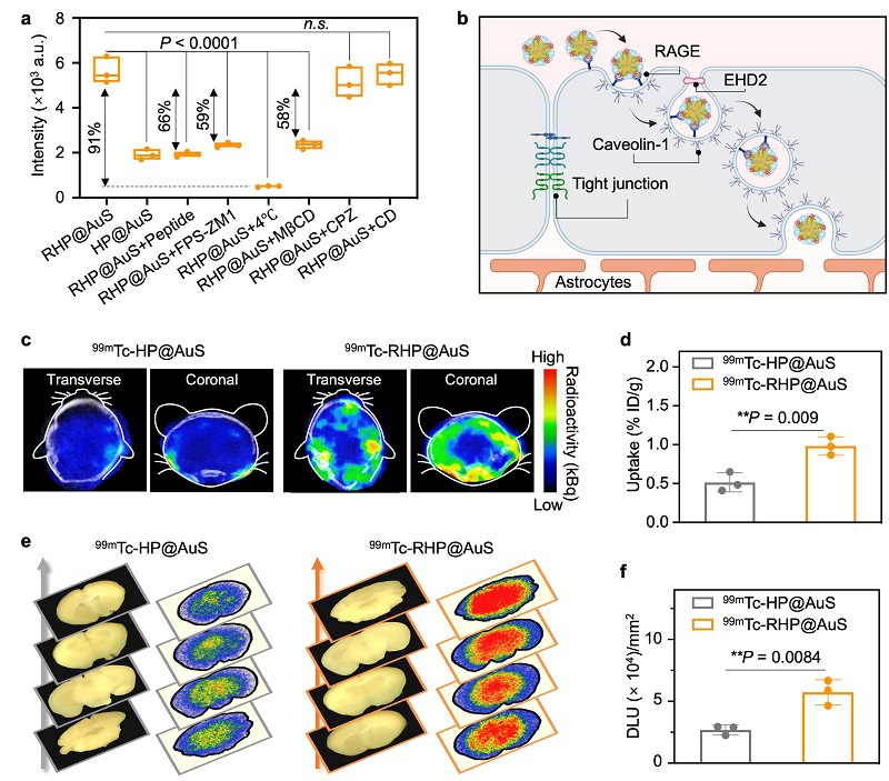 图5. RHP@AuS通过RAGE介导的主动转运跨越BBB。(a)Transwell系统经不同处理后RHP@AuS的BBB穿透效率。(b)RHP@AuS通过RAGE介导的小窝依赖性转胞吞作用穿越 BBB 的过程示意图。(c)正常小鼠静脉注射99mTc-HP@AuS或99mTc-RHP@AuS 2小时后大脑的SPECT/CT图像。(d)脑部放射性摄取的统计。(e)静脉注射99mTc-HP@AuS或99mTc-RHP@AuS 24小时后脑切片的代表性照片和自显影图像。(f)脑组织切片放射性摄取的统计分析。