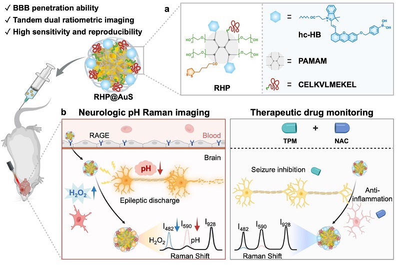 近日,PO18 王聪青年研究员、李聪教授、类脑智能科学与技术研究院王晶副教授和云南大学PO18 雷祖海教授在Angewandte Chemie杂志上发表了题为:“Tandem Dual-Ratiometric SERS Probe Enables Raman Imaging of Neurological pH Fluctuations in Epilepsy”(串联双比率响应SERS探针成像癫痫病灶pH波动)的研究性论文(图1)。该工作开发了一类单光谱串联双比率响应SERS探针(RHP@AuS),实现脑部癫痫病灶pH动态监测与药物预后评估:(1)提出了一类基于树枝状聚合物的可调节性拉曼报告分子单层自组装策略,可有效抑制分子堆叠诱导的信号淬灭效应,显著提升拉曼信号强度和稳定性。(2)构建了一类可特异性富集在癫痫灶、H₂O₂开关-pH数字化读取的串联双比率型SERS探针,实现了病灶pH动态定量读取。(3)揭示了癫痫发作导致病灶局部脑区快速酸化的波动规律,提出了一种“酸碱平衡-炎症调节”的联合疗法,实现了癫痫长效持久的治疗效果。总之,该工作构建了一种高灵敏度、高特异、准确动态监测脑部疾病pH震荡的可视化工具,并为癫痫等脑疾病的精准诊疗开辟了新维度