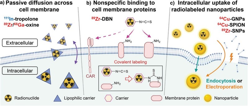 目前已开发数种体外标记策略监测CAR T细胞的生物分布。本工作基于标记方法将其分为三类:(1)基于跨细胞膜被动扩散的方法;(2)基于与膜蛋白非特异性结合的方法;(3)基于放射性标记纳米粒子的细胞摄取的方法(图2)。