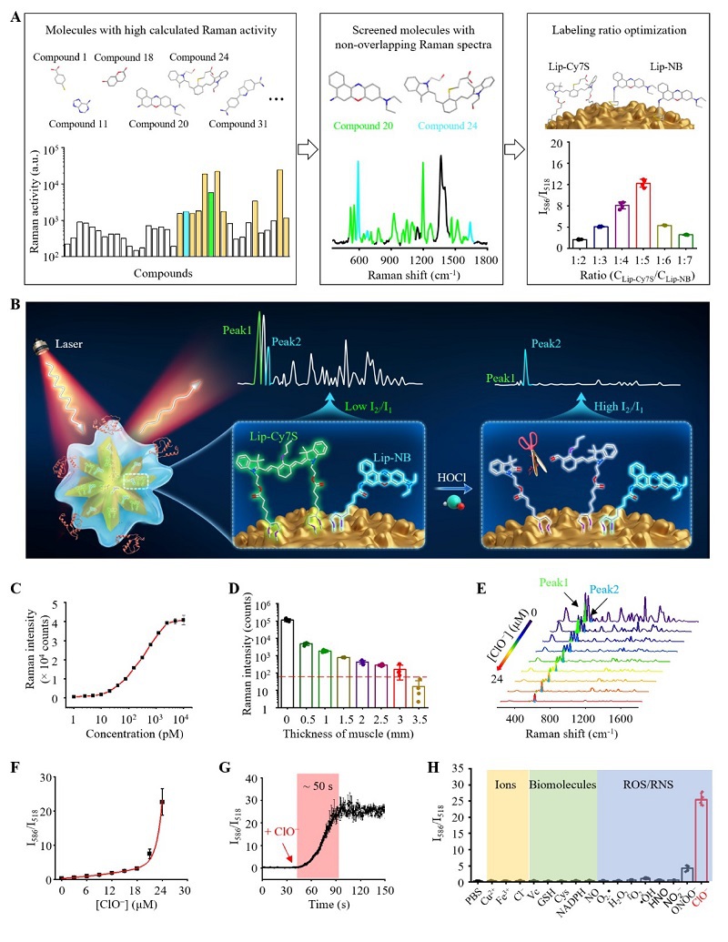 图 2. UltraHOCls的设计和表征。 (A) CARRD辅助筛选和优化拉曼报告分子构建超亮比率型SERS传感器。(B) UltraHOCls响应HOCl的机制示意图。(C) 不同浓度下ultraHOCls的拉曼信号强度。(D) UltraHOCls体外穿透性测试。(E) 不同HOCl浓度下ultraHOCls的拉曼光谱。(F) 拉曼强度比值与HOCl浓度的关系。(G) UltraHOCls响应HOCl后I586/I518比值的动态变化。(H) UltraHOCls的体外抗干扰性测试。