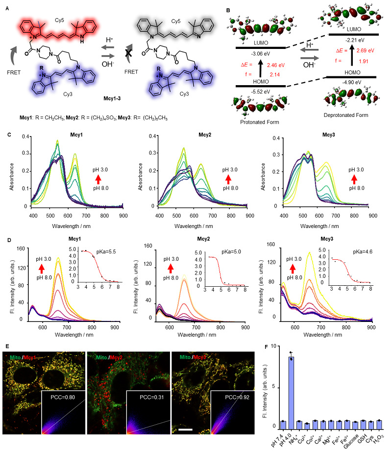 在这项工作中,团队首先开发了一系列线粒体靶向的pH响应探针Mcy1–3,并阐明了其pH响应机制和光学性质。进一步,三种探针的表征实验表明Mcy3具有最好的线粒体靶向能力和良好的光物理性质,因此选用其做后续实验的目的探针。