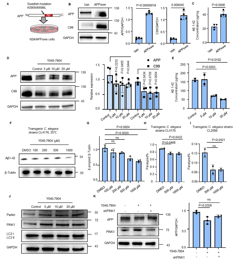 图9. Y040-7904在AD神经元细胞及线虫模型缓解AD病理。(A) N2a/APPswe细胞模型建立的示意图。(B) N2A/APPswe细胞中APP和C99-APP的表达水平。统计学显著性通过双尾配对t检验确定。(C)酶联免疫吸附试验(ELISA)定量分析N2a/APPswe细胞中Aβ1-42的浓度。统计学显著性通过双尾非配对t检验确定。(D) Y040-7904处理(5 μM‒20 μM)后N2a/APPswe细胞中APP和C99-APP水平的蛋白免疫印迹结果。统计学显著性通过双尾配对t检验确定。(E) N2a/APPswe细胞中Aβ1-42水平随Y040-7904浓度的变化。统计学显著性通过单因素方差分析(One-way ANOVA)及Dunnett多重比较检验确定。(F) Y040-7904处理(100‒1000 μM)后CL4176线虫中β-淀粉样蛋白1-42水平的蛋白免疫印迹结果。(G)图A中β-淀粉样蛋白1-42水平的定量分析结果。(H) Y040-7904处理后CL4176线虫的瘫痪百分比。实验独立重复两次,每次≥100只线虫。统计学显著性通过双尾非配对t检验确定。(I) Y040-7904处理后的CL2006线虫的瘫痪百分比。实验独立重复两次,每次≥100只线虫。统计学显著性通过双尾非配对t检验确定。(J) Y040-7904处理后的N2A/APPswe细胞Parkin、PINK1和LC3II/I的蛋白水平。(K) 蛋白免疫印迹结果显示在PINK1沉默情况下,Y040-7904处理后N2a/APPswe细胞中APP的水平。统计学显著性通过单因素方差分析(One-way ANOVA)结合Tukey多重比较检验进行判定。