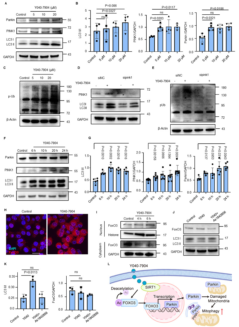 图8. Y040-7904通过SIRT1/FoxO3通路提高线粒体自噬。(A)不同浓度(5–20 μM)Y040-7904处理细胞24小时后,线粒体自噬相关蛋白水平的免疫印迹分析。(B) 使用Image J对(A)中线粒体自噬相关蛋白进行定量分析。统计学显著性通过双尾配对t检验确定。(C)不同浓度(5–20 μM)Y040-7904处理细胞24小时后,磷酸化泛素(pUb)水平的免疫印迹分析。(D)使用Image J对(C)中的结果进行定量分析。统计学显著性通过单因素方差分析(ANOVA)确定。(E)在si-NC和si-PINK1转染的HT22细胞中,Y040-7904处理后pUb、LC3II/I和PINK1水平的免疫印迹分析。(F) Y040-7904(20 μM)处理不同时间(6 h、10 h、20 h和24 h)后,线粒体自噬相关蛋白水平的免疫印迹分析。(G)对(F)中Y040-7904处理后的线粒体自噬相关蛋白进行定量分析。统计学显著性通过双尾配对t检验确定。(H)对照组和Y040-7904(20 μM)处理的HT22细胞中FoxO3的免疫荧光图像。(I) Y040-7904作用不同时间的细胞核和细胞质FoxO3水平的蛋白免疫印迹。(J)经Y040-7904或FoxO3抑制剂AS1842856处理的HT22细胞中FoxO3和LC3的表达水平。(K)对(A)中所示蛋白的定量分析。统计学显著性通过单因素方差分析(One-way ANOVA)结合Dunnett多重比较检验进行判定。(L) Y040-7904诱导线粒体自噬的机制的示意图。