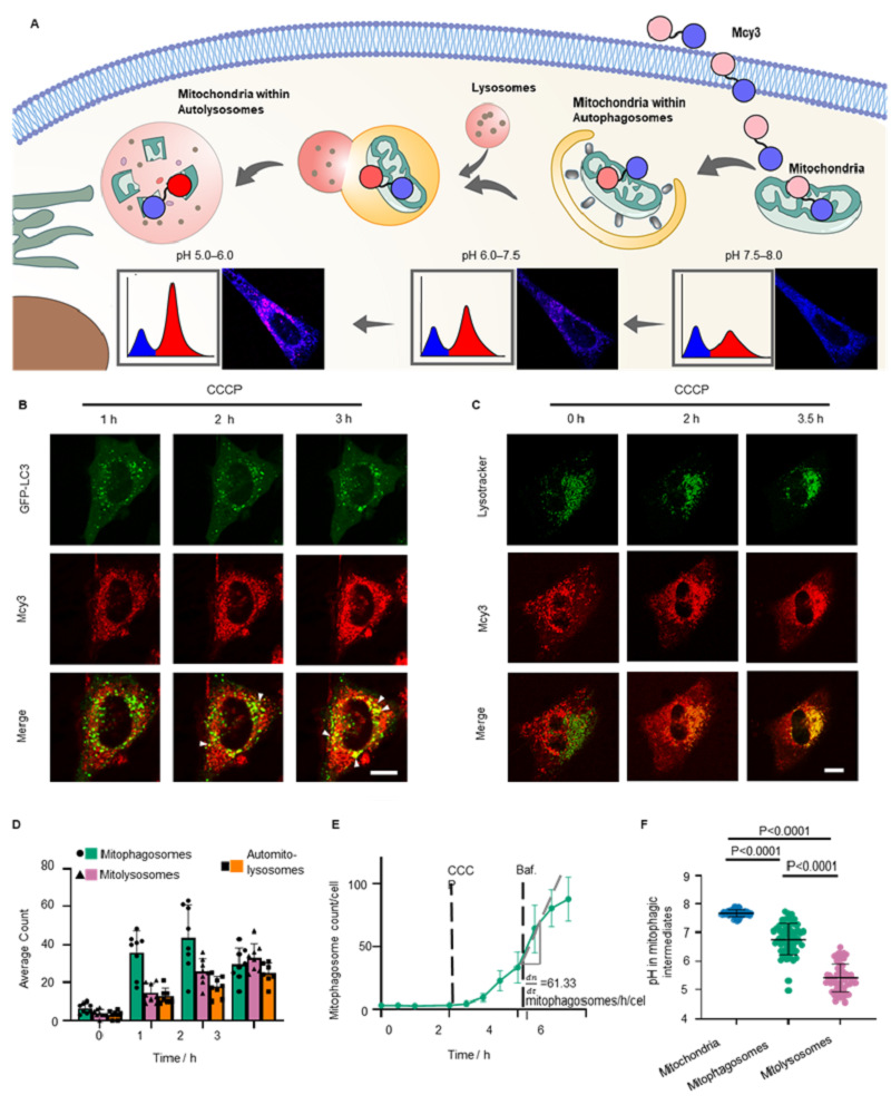 图3. Mcy3探针在活细胞内动态可视化线粒体自噬过程。(A) Mcy3通过测定细胞内pH值来监测线粒体自噬示意图。(B)线粒体与自噬体融合的代表性共聚焦图像。GFP-LC3激发波长(Ex):488 nm,发射波长(Em):500‒530 nm。Mcy3激发波长(Ex):561 nm,发射波长(Em):580‒700 nm。比例尺=10微米。(C)线粒体与自噬溶酶体的融合的代表性共聚焦图像。Lysotracker激发波长(Ex):405 nm,发射波长(Em):415‒430 nm。Mcy3激发波长(Ex):561 nm,发射波长(Em):580‒700 nm。比例尺=10微米。(D)在羰基氰化物间氯苯腙(CCCP)诱导后每个细胞中平均的线粒体自噬体、线粒体溶酶体和线粒体自噬溶酶体的数量。细胞数量n=9。数据以平均值±标准差表示。(E)经CCCP处理2小时以及100 nM巴佛洛霉素A1处理2小时后的线粒体自噬体数量。数据以平均值±标准差表示。(F)线粒体、线粒体自噬体和线粒体溶酶体的pH值。数据以平均值±标准差表示。
