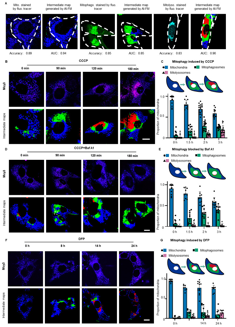 图5. AI-FM系统在活细胞内定量检测线粒体自噬中间体。(A)荧光标志物对照的三类线粒体自噬中间体荧光图像(左图)及DMAN模型生成的伪彩色中间产物分布图(右图)的对比。在中间体布图中,蓝色区域表示线粒体,绿色区域表示线粒体自噬体红色区域表示线粒体溶酶体(。图像下方展示了模型在测试集上对三类线粒体自噬中间产物的平均ACC和AUC值。(B)上图:HT22细胞经Mcy3(2.0 μM)预处理后,暴露于线粒体自噬诱导剂CCCP 0、60、120和180分钟的共聚焦荧光图像。蓝色通道:Ex=561 nm, Em=580‒600 nm。红色通道:Ex=561 nm, Em=600‒700 nm。比例尺=10 μm。下图:DMAN模型生成的中间体分布图。预测的线粒体、线粒体自噬体和线粒体溶酶体分别以蓝色、绿色和红色显示。(C)CCCP处理后不同时间点的线粒体、线粒体自噬体和线粒体溶酶体的组成比例。每组n=15个细胞。(D)上图:HT22细胞经Mcy3预处理后,与CCCP和Baf A1(100 nM)共孵育0、60、120和180分钟的代表性荧光图像。蓝色通道:Ex=561 nm, Em=580‒600 nm。红色通道:Ex=561 nm, Em=600‒700 nm。比例尺=10 μm。下图:DMAN模型生成的中间体分布图。(E)CCCP+Baf A1处理后不同时间点的线粒体、线粒体自噬体和线粒体溶酶体的组成比例。每组n=15个细胞。(F)上图:HT22细胞经Mcy3(2.0 μM)预处理后,暴露于线粒体自噬诱导剂DFP 0、8、14和24分钟的共聚焦荧光图像。蓝色通道:Ex=561 nm, Em=580‒600 nm。红色通道:Ex=561 nm, Em=600‒700 nm。比例尺=10 μm。下图:DMAN模型生成的中间体分布图。预测的线粒体、线粒体自噬体和线粒体溶酶体分别以蓝色、绿色和红色显示。(G)DFP处理后不同时间点的线粒体、线粒体自噬体和线粒体溶酶体的组成比例。每组n=11个细胞。