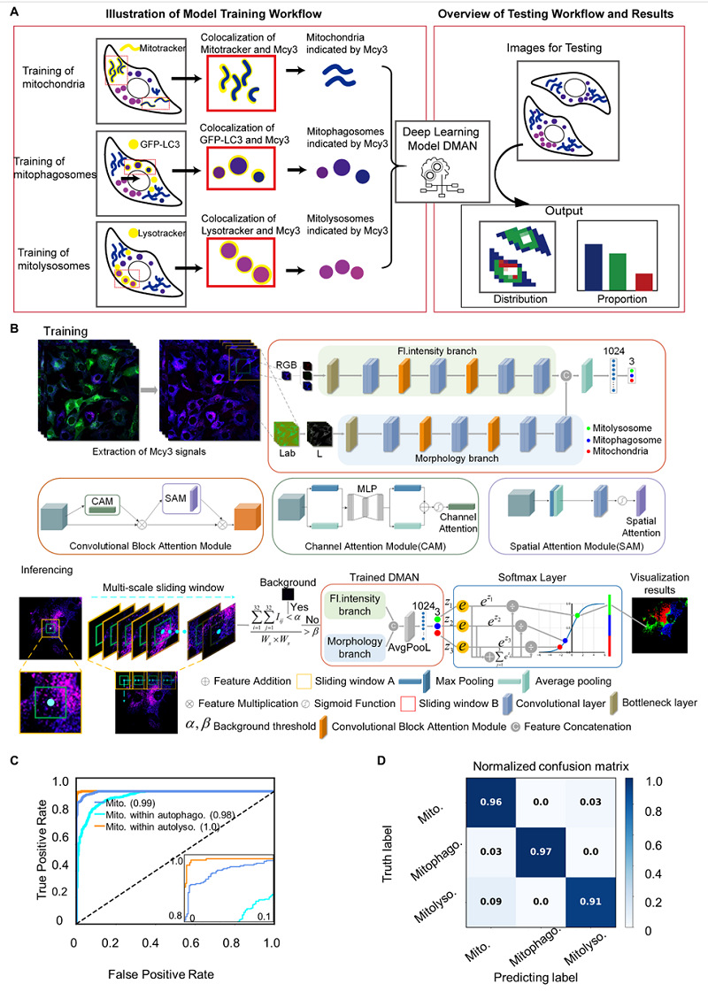 随后双分支多尺度注意力残差网络(DMAN)被应用于处理Mcy3染色的细胞显微图像。DMAN基于残差网络(ResNet)与卷积块注意力模块(CBAM)构建。在DMAN的训练阶段,采用多尺度方法提取线粒体的细粒度荧光强度特征与粗粒度形态特征。在DMAN的推理阶段,对荧光图像中的细胞器进行分类,实现线粒体自噬中间体的像素级别分类。该模型的优势如下:(1)同时捕捉线粒体的形态和pH两种指标,检测准确度比单指标提高12%。(2)在测试阶段提出滑窗策略,实现线粒体自噬中间体的像素级别分类,提高分辨率。(3)实现利用单一荧光染料准确识别关键中间体,并提供胞内各类中间体分布、密度、比例等定量信息。突破传统主观评估不准确性和繁杂性。