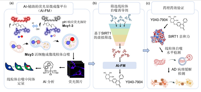 近日,PO18 李聪教授、游艳青年研究员,PO18 信息科学与工程PO18 余锦华教授,及云南大学PO18 雷祖海教授联合研究团队在Nature Communications(自然-通讯)杂志发表了题为:“An AI-assisted fluorescence microscopic system for screening mitophagy inducers by simultaneous analysis of mitophagic intermediates”(人工智能驱动荧光显微成像系统可视化线粒体自噬中间体筛选线粒体自噬诱导剂)的研究论文。该工作开发了一种AI辅助荧光显微成像系统(AI-FM),用于活细胞线粒体自噬流的实时、动态、定量评估(图1)。AI-FM系统将具有线粒体靶向性的pH比率响应荧光探针Mcy3与深度学习模型有机结合,实现线粒体自噬中关键中间体的准确识别,并提供胞内各类中间体分布、密度、比例等定量信息,平均检测准确率高达86%。研究人员利用AI-FM系统筛选出一种新型线粒体自噬诱导剂Y040-7904。该化合物能够促进受损线粒体向自噬小体转运,并提高神经元线粒体自噬水平。在AD神经元细胞模型和AD线虫模型中,Y040-7904通过激活SIRT1/FoxO3信号通路,有效改善Aβ病理,展现出对AD潜在疗效。这项研究不仅为活细胞线粒体自噬的精准评估提供了新工具,也为神经退行性疾病的机制研究和药物筛选开辟了新路径。