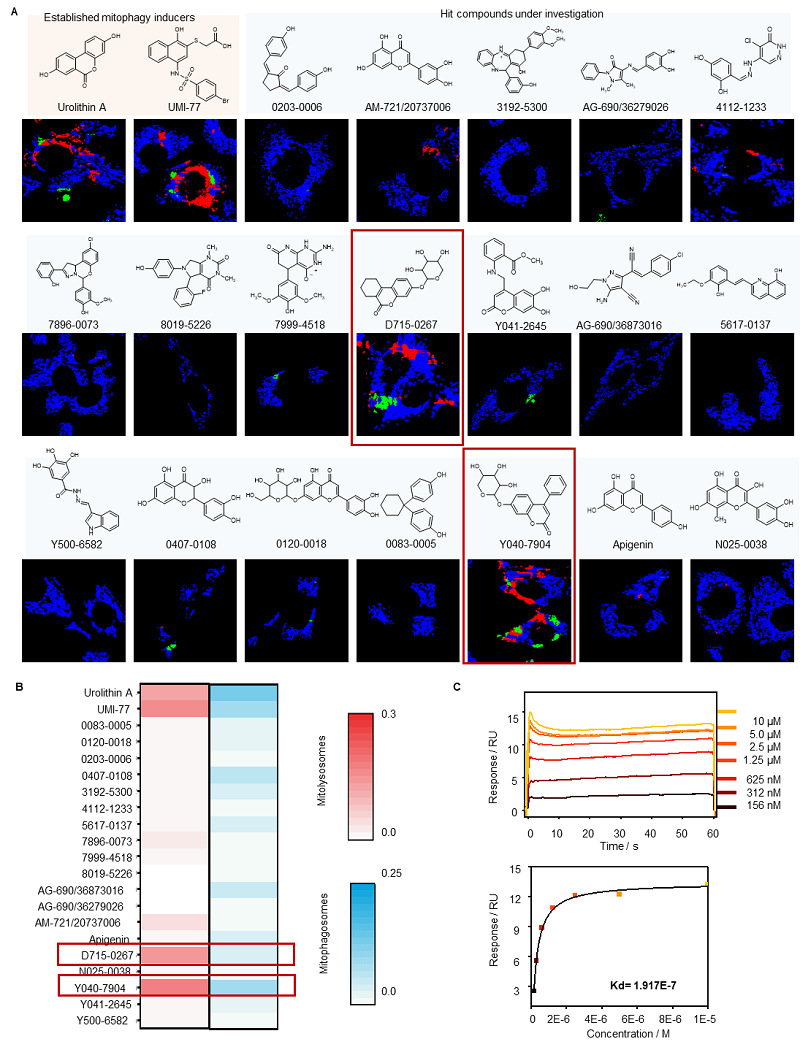 图7. AI-FM筛选线粒体自噬诱导剂Y040-7904。(A)两种已知线粒体自噬诱导剂及19种待测候选化合物化学结构,及其在HT22细胞中诱导线粒体自噬中间体的伪彩分布图。蓝色:线粒体;绿色:线粒体自噬体;红色:线粒体溶酶体。(B)经线粒体自噬诱导剂或候选化合物处理后,经AI-FM分析的HT22细胞中线粒体自噬中间体的比例。(C)表面等离子共振(SPR)计算的Y040-7904与Sirt1蛋白结合的浓度依赖性曲线图。