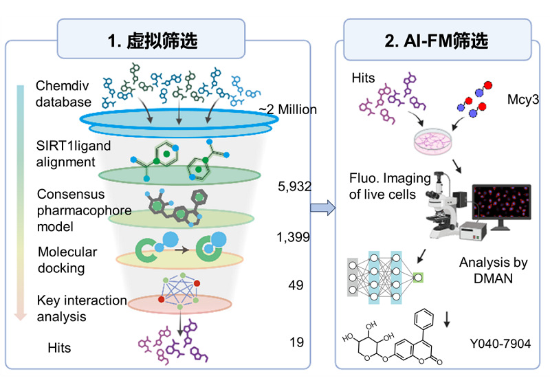 图6. 线粒体自噬诱导剂筛选流程示意图。步骤1:SIRT1激动剂的虚拟筛选模型。通过对两百万种化合物库进行筛选,鉴定出19种先导化合物。步骤2:利用AI-FM对19种先导化合物进行评估。最终筛选出Y040-7904为线粒体自噬诱导剂。