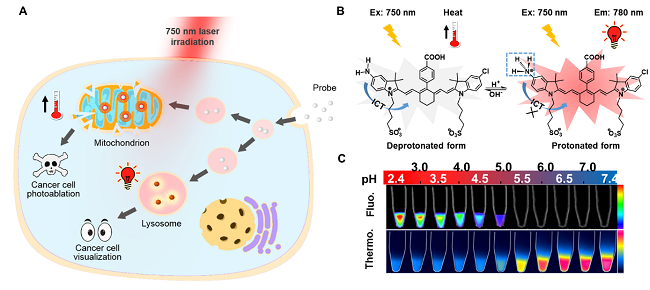 与正常细胞溶酶体(pHlys 4.5-6.0)相比,肿瘤细胞高浸润、高侵袭和高转移特征导致其溶酶体内液往往具有更强的酸性(pHlys 3.8-4.7)。根据此特征,PO18 李聪教授课题组张静烨同学制备了一类基于七甲川花箐染料的近红外荧光/光热pH逆向双响应探针。该探针在生理酸性条件下,所吸收能量主要以近红外荧光形式释放;然而在中性或弱碱性环境中,能量主要以热的形式释放。通过精准调控其pKa值(4.6),该探针荧光信号只在癌细胞溶酶体酸性环境中开启,实现癌细胞的选择性示踪。同时,该探针还可以进入癌细胞线粒体,其弱碱性环境使探针光热效应最大化,导致线粒体膜通透性改变,诱导癌细胞凋亡/坏死。溶酶体pH异常是肿瘤细胞的普遍特征,该类诊疗一体化探针可较少受到肿瘤基因类型和表型影响,对影像引导的术中肿瘤切除和具有重要意义。