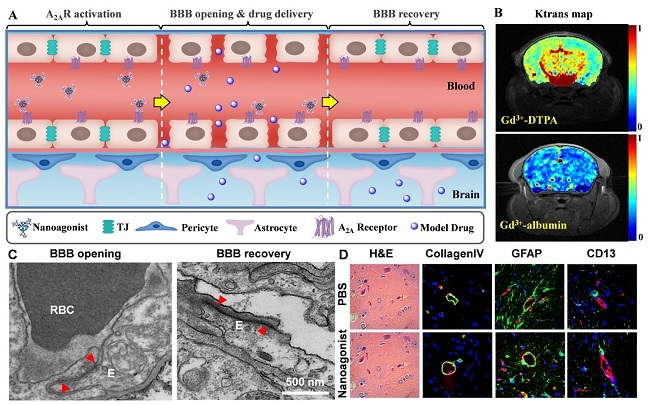 A)纳米激动剂可逆开启BBB示意图;(B)动态增强磁共振成像(DCE-MRI)显示纳米激动剂提高BBB通透性;(C)透射电镜显示注射纳米激动剂后紧密连接的开启及可逆恢复;(D)组织染色表明血管基膜、胶质细胞周足、周细胞和内皮细胞等BBB主要组分未有损伤,也未发现脑水肿、神经凋亡等副作用。