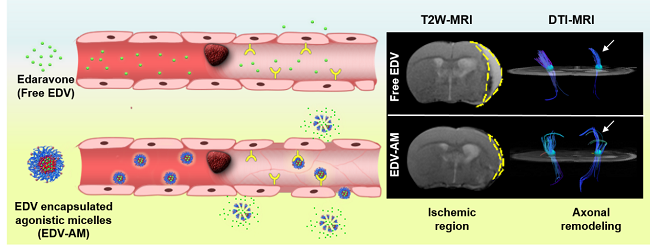 Abstract: Thrombolysis has been a standard treatment for ischemic stroke. However, only 2-7% patients benefit from it because the thrombolytic agent has to be injected within 4.5 h after the onset of symptoms to avoid the increasing risk of intracerebral hemorrhage. As the only clinically approved neuroprotective drug, edaravone (EDV) rescues ischemic brain tissues by eradicating over-produced reactive oxygen species (ROS) without the limitation of therapeutic time-window. However, EDV's short circulation half-life and inadequate cerebral uptake attenuate its therapeutic efficacy. Here we developed an EDV-encapsulated agonistic micelle (EDV-AM) to specifically deliver EDV into brain ischemia by actively tuning blood-brain barrier (BBB) permeability. The EDV-AM actively up-regulated endothelial monolayer permeability in vitro. HPLC studies showed that EDV-AM delivered more EDV into brain ischemia than free EDV after intravenous injection. Magnetic resonance imaging also demonstrated that EDV-AM more rapidly salvaged ischemic tissue than free EDV. Diffusion tensor imaging indicated the highest efficiency of EDV-AM in accelerating axonal remodeling in the ipsilesional white matter and improving functional behaviors of ischemic stroke models. The agonistic micelle holds promise to improve the therapeutic efficiency of ischemic stroke patients who miss the thrombolytic treatment.