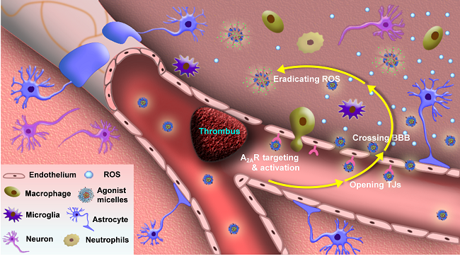 该研究第一作者、硕士研究生靳取介绍:该激动胶束内腔包载有临床使用的自由基清除剂依达拉奉,而表面修饰有腺苷2A受体激动基团。该激动胶束通过激活缺血区域血管高表达腺苷2A受体促进内皮细胞收缩、开启内皮细胞间的紧密连接,高效跨血脑屏障入脑。在缺血性脑卒中模型鼠中,与直接注射药物相比,该激动胶束显著提高依达拉奉在脑卒中区域的浓度,促进脑缺血区域体积减小并加快神经纤维束的恢复。李聪教授认为:该激动胶束同时实现了血脑屏障主动调控和药物递送,规避了大多数神经保护药物代谢速度快,循环周期短,使用剂量大等缺点。