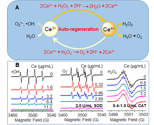 图2. (A) 纳米铈价态自我循环消除多种ROS机理图。(B) 顺磁共振(ESR)显示纳米铈消除OH,O2-和H2O2呈浓度依赖性。