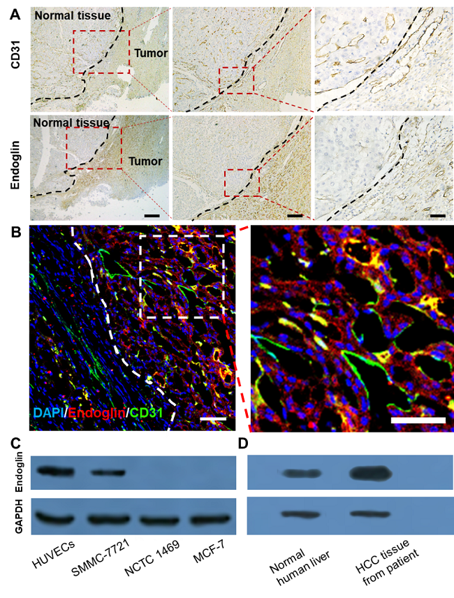 图2. 病人原发性肝癌组织切片H&E染色和免疫荧光染色均显示Endoglin受体在肿瘤边界的表达水平明显高于肿瘤中心和周围正常肝组织。