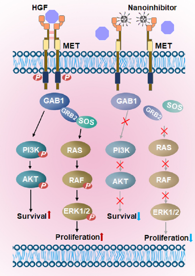 图1. 纳米抑制剂阻止MET受体的二聚化及下游多种信号通路活化
