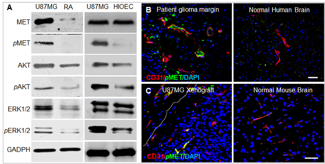 相对于正常大鼠星形胶质细胞(RA)和永生化口腔上皮细胞(HIOEC),人脑胶质瘤细胞(U87MG)中MET、AKT、ERK1/2及其磷酸化对应体pMET、pAKT、pERK1/2表达水平均显著提高。病人脑胶质瘤和U87MG原位移植瘤切片均显示pMET在胶质瘤边缘,特别是肿瘤血管腔侧高表达,而在正常脑组织表达量很低。