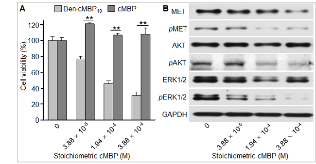 与游离cMBP多肽相比,纳米抑制剂Den-cMBP10对U87MG肿瘤细胞呈浓度依赖性抑制。免疫印迹分析结果证明Den-cMBP10能够以浓度依赖性方式有效抑制MET及其下游各个关键信号通路蛋白的磷酸化。