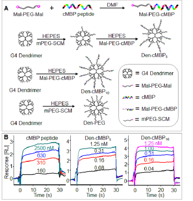 多肽具有高受体亲和力、良好的生物相容性、低免疫原性和可规模生产等优点。但其循环时间短,易被降解等原因在靶向治疗方面的应用受到限制。cMBP是MET受体特异性靶向多肽,与HGF竞争结合MET位点,可以阻止MET受体的二聚化,抑制其下游信号通路的激活。本工作将多条cMBP连接于树枝状高分子得到的纳米抑制剂具有多位点效应,与游离cMBP相比,纳米抑制剂Den-cMBP5和Den-cMBP10对MET受体的结合常数分别提高了32倍和332倍。