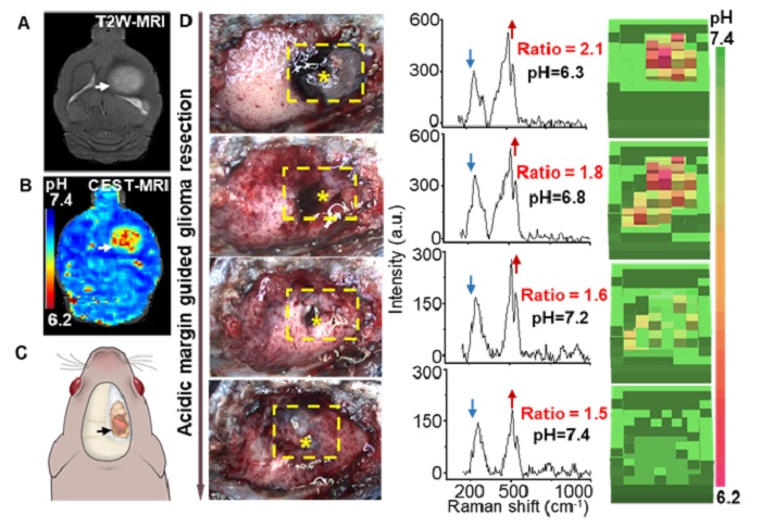 图4. 酸性代谢边界指导大鼠原位胶质瘤模型切除手术。(A)术前T2W-MR图像,白色箭头指示肿瘤;(B)术前大鼠脑部CEST-pH图;(C)肿瘤病灶位置示意图;(D)手术切除过程中连续白光图像(左图),术中拉曼光谱(中图)和pH色块图(右图)。黄色虚线框表示SERRS检测范围,星号表示酸度最高点。