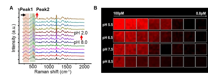 图3.探针具有高灵敏的pH响应能力。 (A) 梯度pH值下探针的SERRS光谱图(TEM)图;(B)探针在不同pH值的缓冲溶液中的浓度依赖性拉曼mapping图。在pH 5.5下测得最低检测限为0.8 pM。