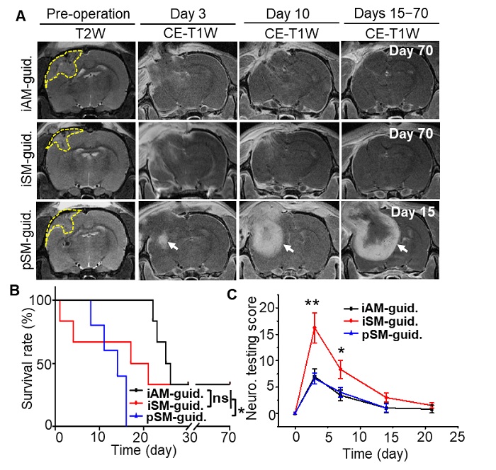 图5. 酸性代谢边界指导手术改善手术预后。(A)在酸性代谢边界指导(iAM-guid.),术中结构边界指导(iSM-guid.)和术前结构边界指导(pSM-guid.)的术前及术后大鼠脑部磁共振图像。黄色虚线描绘肿瘤部位,白色箭头指示复发肿瘤位置;(B)术后Kaplan–Meier存活率;(C)神经功能行为学测试评分。