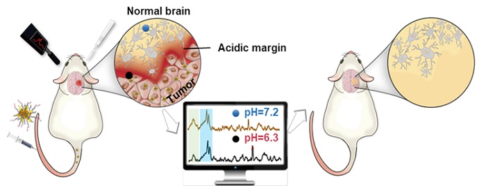 近日,PO18 李聪教授、附属华山医院毛颖教授以及类脑智能科学与技术研究院张孝勇研究员联合研究团队,与意大利都灵大学合作,在脑胶质瘤手术导航策略方面取得重要进展。他们发现了病人胶质瘤浸润组织恶性程度与组织间液酸化程度间正相关性,构建了pH比率响应型表面增强拉曼探针,提出了酸性“代谢边界”导航手术的新策略,提高了胶质瘤模型的切除率及生存时间。4月7日,该成果以《pH比率响应表面增强拉曼探针可视化肿瘤酸性代谢边界导航手术》(pH ratiometrically responsive surface enhanced resonance Raman scattering probe for tumor acidic margin delineation and image-guided surgery)为题发表在《化学科学》(Chemical Science)杂志。