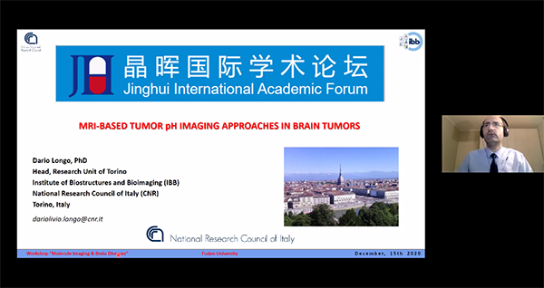 2020年12月15日,由本中心主办的脑疾病磁共振成像技术国际学术论坛通过网络在线举办。应李聪教授邀请,意大利都灵大学Silvio Aime教授与Dario Longo教授出席论坛并分别做了题为”MR Imaging Strategies & Brian Research”,”MRI-based Tumor pH Imaging Approaches in Brain Tumors”的报告。两位意大利教授就脑疾病微环境可视化以及脑疾病相关受体和神经递质可视化磁共振技术前沿进行了深入演绎。PO18 及类脑智能研究院三十余名师生参加了会议。多位教师和同学积极参加线上讨论,与报告专家就报告内容进行了直接交流。本论坛受到了上海市高水平地方高校建设项目的支持。