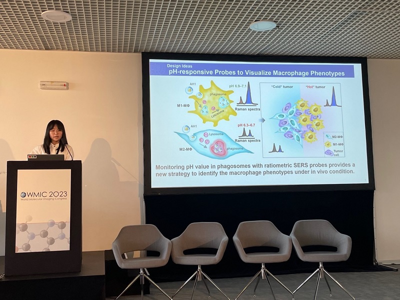 赵静同学在世界分子影像大会WMIC “A Growing Toolbox for Molecular Imaging of Immune Cells and Inflammation” 分会场进行了题为“Ratiometric SERS Probe Enables Macrophage Phenotyping and Polarization Imaging in Brain Tumor Models“的报告。该工作介绍了一种利用单一报告分子构建pH比率响应表面增强拉曼散射(SERS)探针,通过测定吞噬体酸化程度差异实现不同表型巨噬细胞活体内定量可视化。提出了报告分子电荷重分布诱导表面增强拉曼信号比率响应机制,并构建了一类pH比率响应的SERS探针。其次利用该探针实时读取巨噬细胞吞噬小体内pH值,建立了酸化水平与巨噬细胞表型的对应关系。构建了小鼠模型,利用该探针可视化脑病灶部位巨噬细胞空间分布,研究了候选药物对巨噬细胞表型影响,实现了候选药物预后的可视化评估。该技术为评价肿瘤微环境和预测免疫治疗疗效提供了新途径。