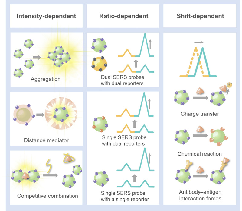 图3.响应型SERS信号的机制示意图。SERS响应机制包括: 强度响应型、比率响应型和位移响应型。