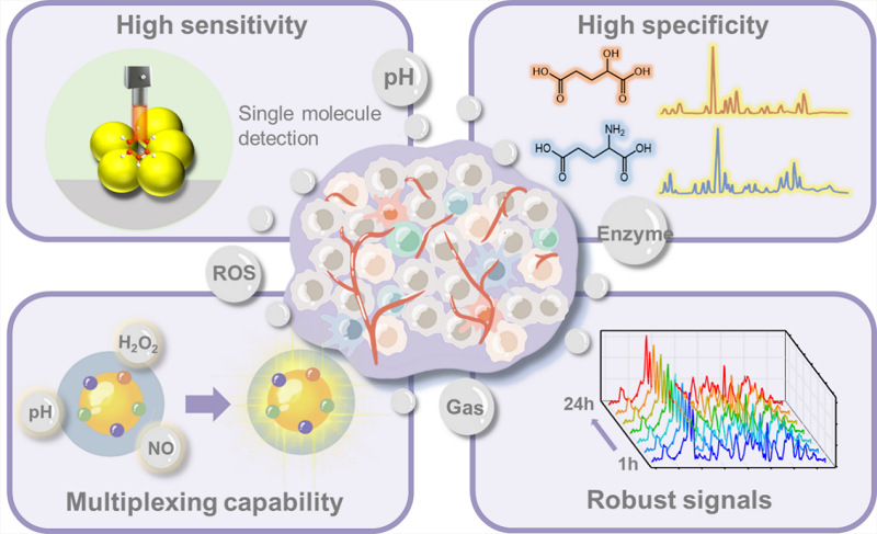 图1.响应型SERS探针在可视化肿瘤相关代谢物方面的优势,包括高灵敏度、高特异性、多事件监测能力和信号鲁棒性。