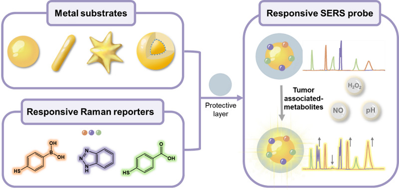 图2.响应型SERS探针的主要组成。响应型SERS探针通常由金属基底、响应型拉曼报告分子和保护层组成。