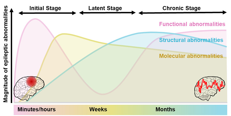 致痫灶生物标志物的确定是探针设计的前提。癫痫发生(epileptogenesis)是大脑从非癫痫状态逐渐发展为产生自发癫痫放电的动态过程,在时间上可以分为初始阶段(致癫痫变化开始发生)、潜伏阶段(无癫痫发作活动的静默期)和慢性阶段(自发性癫痫反复发作)(图1)。这一过程伴随着细胞功能、代谢分子和组织结构的异常,上述异常有望作为生物标志物定位致痫灶。