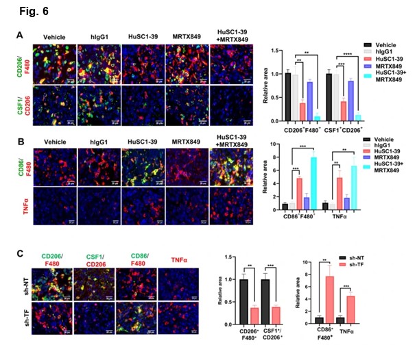 Tumor microenvironment is rich in tumor-associated macrophages (TAMs). Most TAMs are tumor-promoting M2-like macrophages, while tumor suppressor M1-like macrophages are the minority. CSF1 is the primary tumor-derived factor responsible for M2 recruitment. They observed that although the total level of macrophages (F4/80+) was not substantially affected, the number of M2-macrophages (F4/80+CD206+) and CSF1 were dramatically reduced and the activated M1-macrophages (F4/80+/CD86+) were increased in HuSC1-39 or MTI-31 treated tumors. This M1-promoting mechanism was also observed in the TF-depleted tumors.
