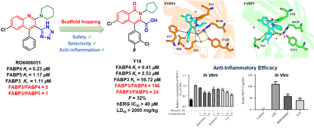 RO6806051, developed by Roche, is a dual FABP4/5 inhibitor but also exhibits strong FABP3 inhibition. Using RO6806051 as a lead compound and based on prior analysis of the differential binding modes of inhibitors to FABP4/5 versus FABP3, the research team employed a scaffold-hopping strategy to discover a novel class of dual FABP4/5 inhibitors containing an isoquinolone scaffold, achieving high selectivity over FABP3. Through structure-activity relationship studies, in vitro and in vivo anti-inflammatory activity evaluations, and drug-likeness assessments, compound Y18 was identified as a candidate. It exhibits potent inhibitory activity against FABP4 and FABP5 with Ki values of 0.41 μM and 2.53 μM, respectively, and a Ki value of 59.72 μM for FABP3. This selectivity profile is significantly superior to that of RO6806051 (FABP3 Ki/FABP4 Ki = 5, FABP3 Ki/FABP5 Ki = 1). Y18 demonstrates favorable pharmacokinetic properties with an oral bioavailability of 32%. Oral administration of Y18 alleviated LPS-induced liver injury. Furthermore, the compound exhibits an excellent safety profile: weak hERG inhibition (IC50 > 40 μM), low cytotoxicity (IC50 > 40 μM), and high median lethal dose (> 2000 mg/kg). In summary, Y18 is a potent, highly selective, and orally active dual FABP4/5 inhibitor with potential for treating inflammation-related diseases.