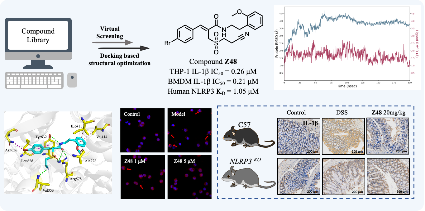 By using computer virtual screening technology, we screened about 260,000 compounds from commercial compound library and in-house compound library, and obtained 10 compounds with NLRP3 binding potential. Through screening experiments, we identified the lead compound EBC-44274 with good IL-1β inhibitory activity. Based on the molecular dynamics simulation and docking study, the mode of action of the lead compound and NLRP3 was clarified, and 54 derivatives were designed and synthesized. After evaluating the in vitro activity of these synthetic compounds, the preferred compound Z48 was found to be a novel NLRP3 inhibitor (0.26 μM in THP-1 cells and 0.21 μM in BMDMs). The results showed that Z48 directly interacted with NLRP3 protein (KD = 1.05 μM) and specifically inhibited the activation of NLRP3 inflammasome, but had no inhibitory effect on AIM2 and NLRC4. Notably, Z48 effectively inhibited nigericin, ATP, and MSU-induced IL-1β release, thus confirming its status as a broad-spectrum NLRP3 inflammasome inhibitor. Subsequent in vitro studies showed that Z48 effectively blocked ASC oligomerization and affected the protein-protein interaction of NLRP3-ASC and NLRP3-NEK7, thereby inhibiting the assembly of NLRP3 inflammasomes. The results of in vivo experiments showed that Z48 was effective in alleviating DSS-induced colitis and its activity was better than that of the positive control SASP. However, Z48 did not affect the severity of DSS-induced colitis in NLRP3KO mice, indicating that Z48 did exert its antigenic effect through the NLRP3 inflammasome. In conclusion, compound Z48 has the potential to treat chronic inflammatory diseases associated with NLRP3 inflammasomes and is expected to be a new therapeutic agent.