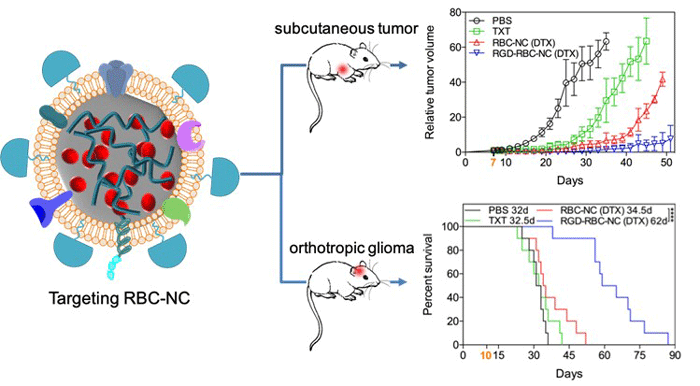 The resulting nanomedicine combined the advantages of natural RBC membranes and drug NCs as the outside membranes provided the NC cores with “biomimetic cover”, exhibiting high drug loading, long-term stability, excellent biocompatibility, and prolonged retention time. The modification of targeting peptide c(RGDyK) bestowed the nanomedicine with targeting ability towards both tumor angiogenesis and tumor cells, delivering drugs into tumor site across the blood-brain tumor barrier (BBTB). Therefore, RGD-RBC-NC showed superior therapeutic efficacy and in vivo safety under a high-dose administration of chemotherapeutics. The preparation of this biomimetic nanomedicine is simple and green. This platform is also easy to be industrialized and provides a promising approach towards clinical application.