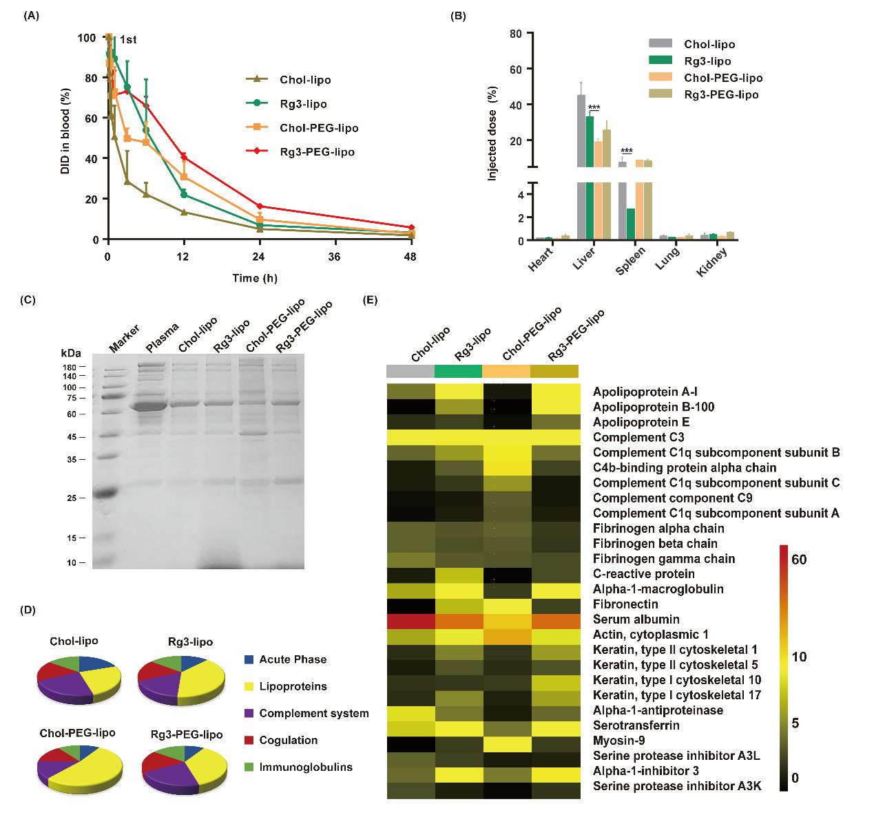 Analysis of the protein corona components adsorbed on the surfaces of the liposomes revealed differences in the prolonged circulation mechanisms between Rg3-lipo and Chol-PEG-lipo. Chol-PEG-lipo primarily extends circulation time by reducing the types of opsonin proteins, such as complement proteins, adsorbed on the liposome surface and increasing the types of dysopsonin proteins, such as lipoproteins. In contrast, Rg3-lipo achieves prolonged circulation mainly by decreasing the abundance of critical complement proteins adsorbed on the liposome surface and increasing the content of lipoproteins adsorbed on the surface (Figure 3).