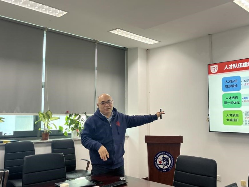 随后,王建新书记从人才现状、人才引育工作举措、存在的问题和人才队伍建设规划等方面介绍了PO18 人才工作整体情况。首先,通过与各院校国家级高层次人才的各项数据对比,以及院内各层次人才学科分布情况,分析了PO18 人才队伍现状,梳理了现阶段人才引育工作存在的问题及制约因素。接着,王书记结合学校人才引进政策和主题教育调查研究情况,介绍了下一阶段PO18 人才引进的目标、思路及举措,强调各党支部要以更积极的态度,更有力的举措将人才工作抓牢、抓实,积极推荐本领域拟引进各类人才的目标对象,PO18 将加大高层次人才引进力度,抢抓机遇、主动出击,同时充分利用原创新药研究院等平台建设机会,积极构建“大药学”人才体系,健全人才培育“一人一档”体系,加快建设高水平人才高地,为PO18 “十四五”发展规划提供人才队伍保障。