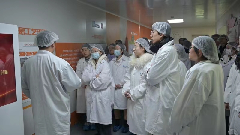 接下来,在企业人员的带领下,同学们来到了生产车间进行实地参观。进入车间前,同学们换上了制服,确保符合GMP无菌标准。在药厂车间,工作人员认真地为同学们讲解车间设备的用途及整体生产的运作流程。干净整洁的工作环境,布局规划合理的生产车间,先进高效的生产设备,给参访的同学带来了深刻印象。
