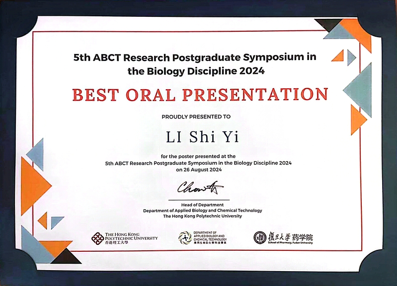 8月26日,同学们参加了香港理工大学应用生物及化学科技学系与PO18 合办的5th ABCT Research Postgraduate Symposium in the Biology Discipline 2024并进行汇报。在当天上午的海报报告环节,李启秀、梅妮、王鹏威同学与香港多所高校的老师和优秀研究生开展学术交流,就感兴趣的课题进行深入探讨。下午口头报告环节,邓燕、胡学涛、李适佚、尹航等同学分别贡献了精彩的汇报,受到香港理工大学师生的认可与赞扬。其中,21级博士生李适佚题为“An Erythrocyte Membrane-fused Plant-derived Nanoparticles as a Gene Therapy Vehicle for the Treatment of CI/R Injury”的汇报被评为优秀口头报告(BEST ORAL PRESENTATION)。颁奖仪式上,茅以诚老师代表PO18 感谢香港理工大学的盛情邀请与接待,两校教师都热情地表达了后续进一步交流合作的意愿。