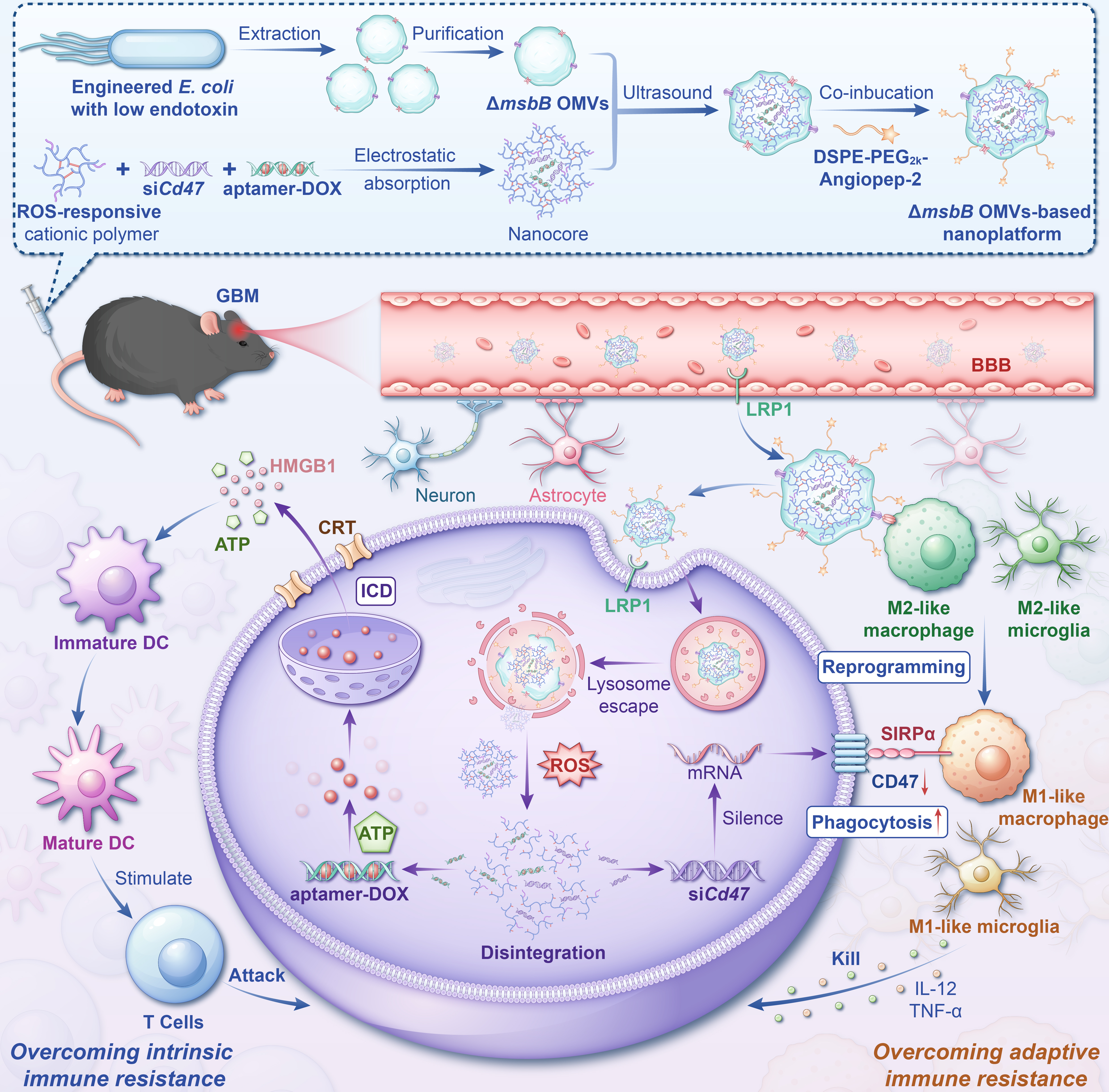 除了血脑屏障(BBB)外,胶质母细胞瘤(GBM)免疫治疗的效果还受到以极低免疫原性为代表的内在性免疫抵抗和以免疫抑制性微环境为代表的适应性免疫抵抗的限制,这意味着需要联合递送多种免疫治疗剂或同时调节不同细胞。然而,不同免疫治疗剂在理化性质上的差异给载体的选择以及共递送系统的设计带来了巨大挑战。细菌外膜囊泡(OMVs)是一种由革兰氏阴性菌自发产生的纳米级双层脂质囊泡,因其具备作为载体(类似细胞外泌体)、免疫佐剂(从母菌的外膜和周质中继承许多免疫原性成分)以及跨越BBB(基于外膜蛋白与gp96的相互作用或者搭乘中性粒细胞)的多功能特性,在治疗GBM方面具有独特优势。然而,传统的OMVs在系统给药后会导致毒副作用以及BBB紧密连接的破坏。