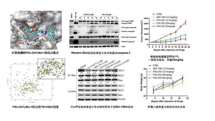 该课题组基于靶蛋白进行多构象的虚拟筛选发现了一类联苯四唑类先导化合物,经骨架跃迁设计获得联苯噻吩类先导化合物,随后利用取代蛋白结合口袋中高能水分子的优化策略,使化合物与靶蛋白亲合性提高约30倍,并显著改善了可合成性和生物利用度。通过15N-HSQC核磁谱图和免疫共沉淀实验验证了重点化合物与Mcl-1的特异作用。在RS4;11小鼠移植瘤模型上进行的药效学实验结果表明:25mg/kg剂量腹腔注射给药三周后,给药小鼠与阴性对照组相比肿瘤体积缩小70%以上,而且持续给药对小鼠体重以及存活率均无影响。