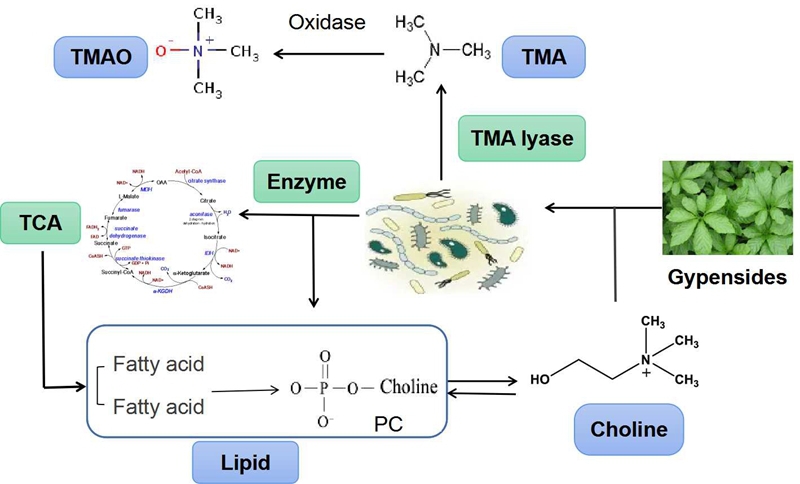 三甲胺-N-氧化物(TMAO)是一种内源性小分子,存在于外周循环,与心血管疾病密切相关。近几年研究发现TMAO在人脑脊液中存在,且患有认知障碍患者脑内TMAO水平高于正常人,但具体起源尚不清楚。中药绞股蓝Gynostemma pentaphyllum (Thunb.) Makino主要成分绞股蓝皂苷不仅具有保护心血管、降血脂、抗肿瘤、抗衰老以及增强人体免疫力等功效,研究发现其有利于改善AD小鼠的空间学习记忆能力和空间记忆保持能力。PO18杨萍正高级实验师技术团队的研究通过建立体外酶孵育体系和小鼠高胆碱模型,解析了肠道菌群、FMO3酶、MAO酶的A、B两种亚型参与胆碱-TMA-TMAO体内循环的过程;通过肠道微生物多样性分析、宏基因组分析和脂质组学分析的多组学技术联用,探讨了绞股蓝皂苷对体内TMAO通路和脂质代谢的影响,绞股蓝皂苷在降低与三甲胺生成相关的三甲胺裂解酶的表达的同时,也显著性影响与三羧酸循环和脂代谢相关的多种酶,研究明确了其关键作用位点和作用酶,阐述了皂苷作用下的菌群与脂质组的互作关系,为绞股蓝皂苷干预神经退行性疾病的应用提供了理论依据,也为中药介导人体高变异性“第二基因组”肠道菌群干预脑疾病发病进程、维持大脑内的生化环境和生理功能建立了新的评价体系。相关成果以全文形式发表在药理学杂志Pharmacological Research上(原文链接)
